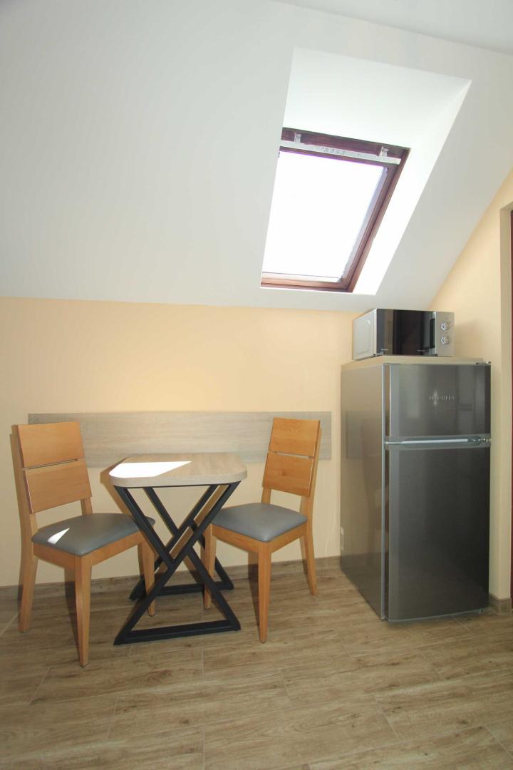 Studio 02 - pokoik z aneksem kuchennym. Do spania dwie rozkładane kanapy, tv, łazienka z prysznicem. Mogą zamieszkać tu dwie osoby dorosłe + 2 dzieci. W aneksie kuchennym lodówka, płytka grzewcza, mikrofalówka, naczynia. Parter.